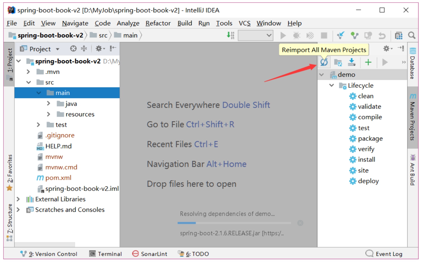 在IDEA开发工具上,找到刷新依赖的按钮(Reimport All Maven Projects),下载相关的依赖包,这时开发工具开始下载Spring Boot项目所需的依赖包,如图1-11所示。