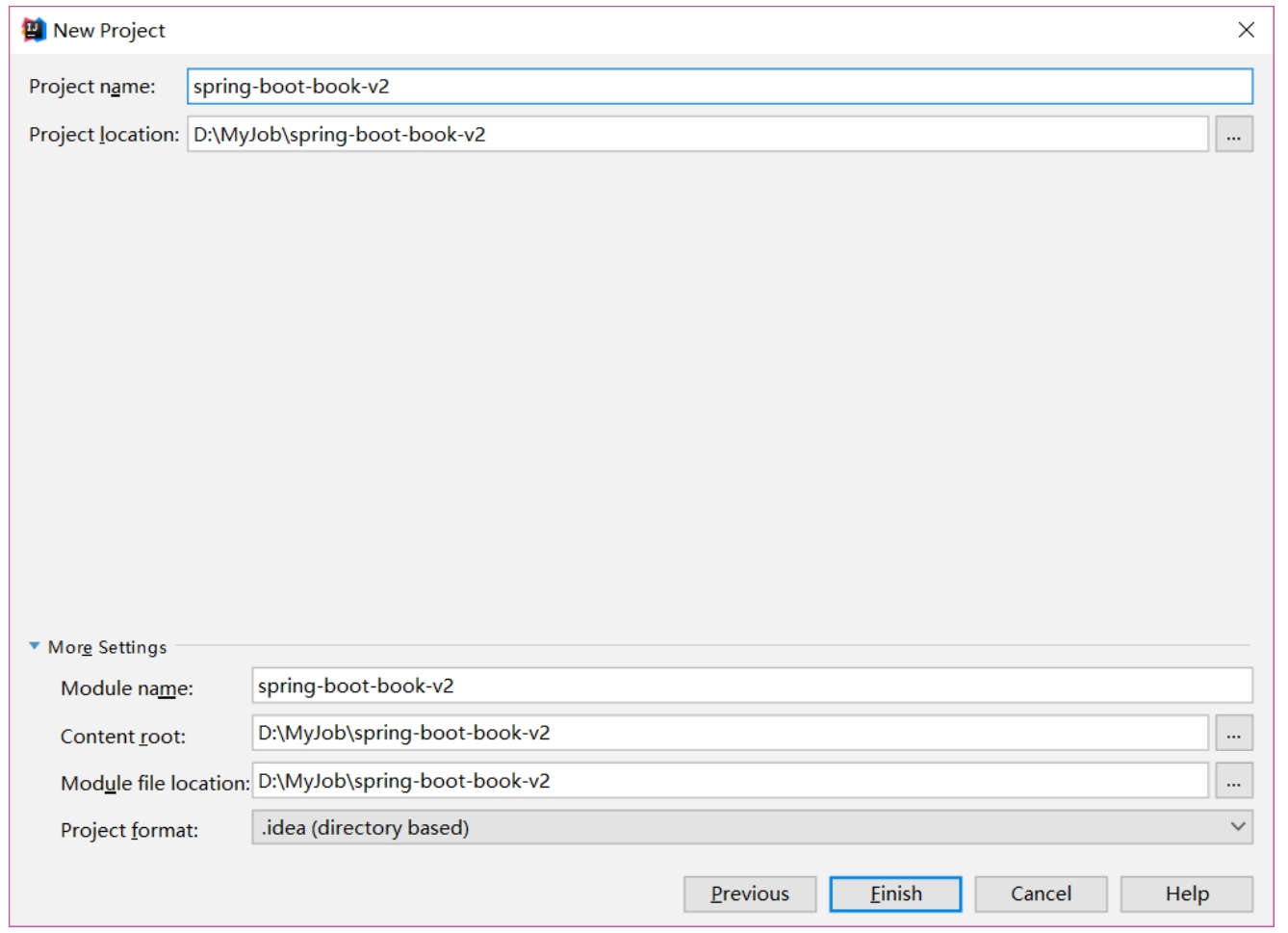 输入项目名称【spring-boot-book-v2】和项目存放目录,其他默认即可,然后单击【Finish】按钮。至此,一个完整的Spring Boot项目即创建完成,具体如图1-9所示。