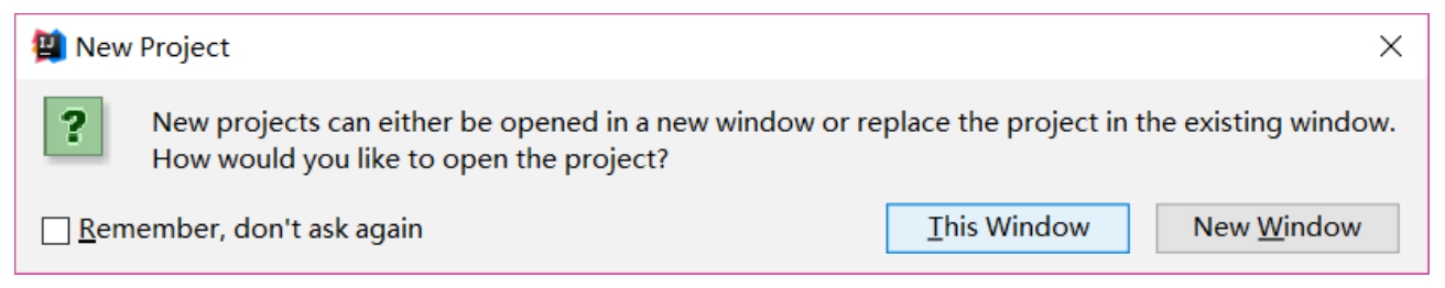 如果开发工具弹出如图1-10所示的对话框,是提示你已经打开其他的项目,新创建的项目是否要在新的窗口打开。单击【New Window】表示在新的窗口打开项目,单击【This Window】表示在当前窗口打开项目,我们选择【New Window】按钮即可。