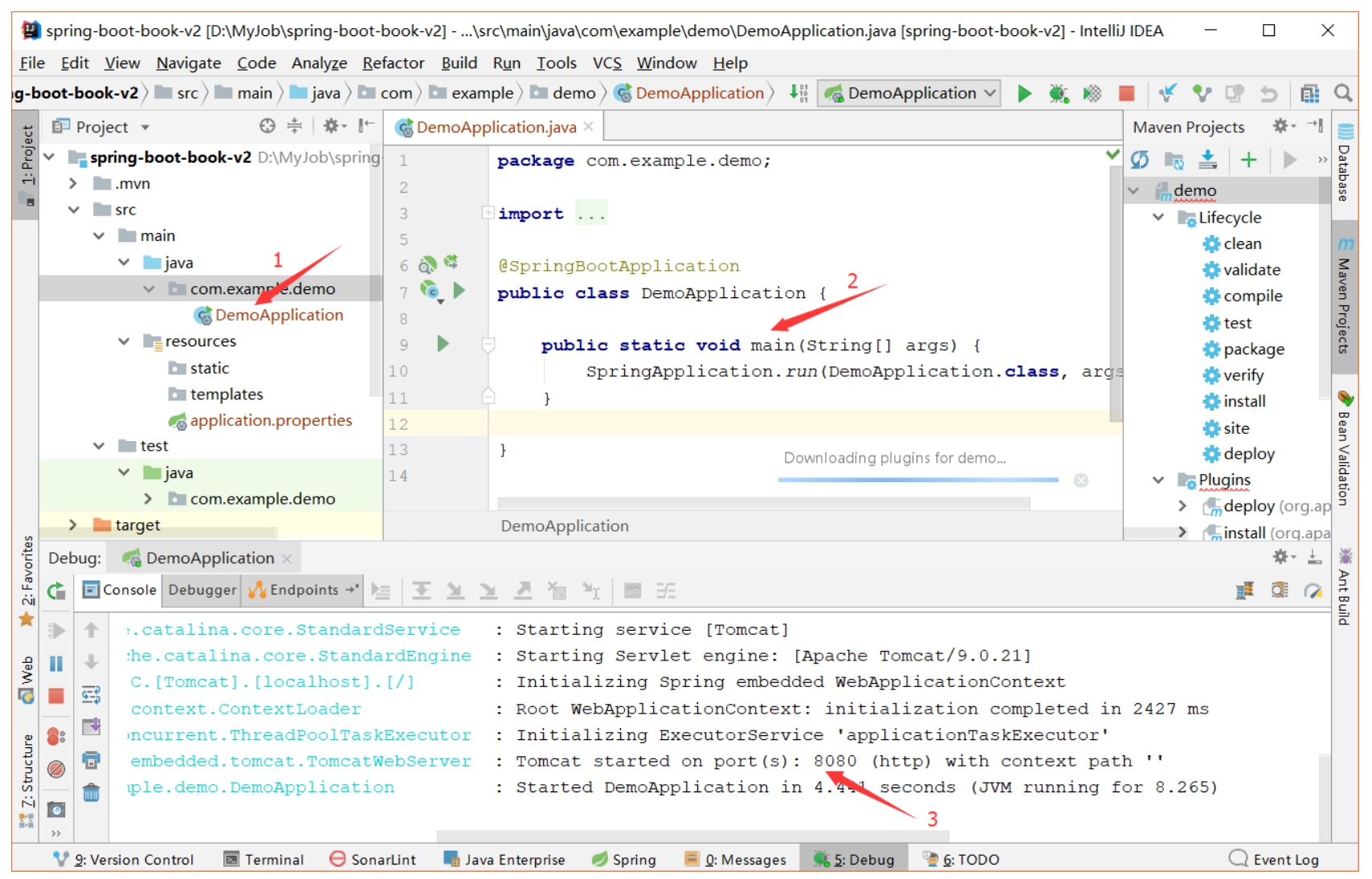 在1.2.1节中,我们是使用DemoApplication中的main方法启动Spring Boot,即: