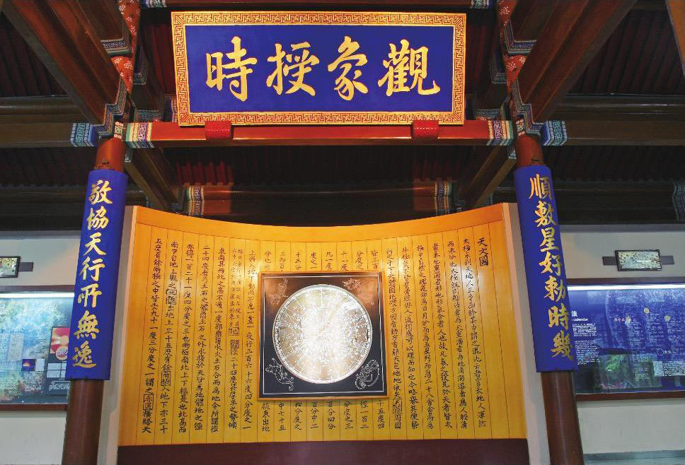 今天走进这座古观象台,穿过月亮洞入口,即踏入一进院落。院中古树苍天,整洁幽静。正房是一座面阔五间的殿宇,门楣悬挂的匾额上书有“紫微殿”三个字,两旁有东西厢房、配房。据工作人员介绍,辛亥革命后,古观象台几经易手,几度改建,如今只有这座紫微殿是真正的老建筑。仔细观察,紫微殿粗大的梁柱、精美的彩绘显示出它与院里其他仿古建筑的不同。殿内挂着“观象授时”的匾额,两旁的楹联题为“顺敷星好勅时几,敬协天行所无逸”。据《日下旧闻考》记载,这些字都是乾隆皇帝御书。明清年间,负责观象台的主事官就在殿里办公,如今整个院落都布置成展览区向公众开放。