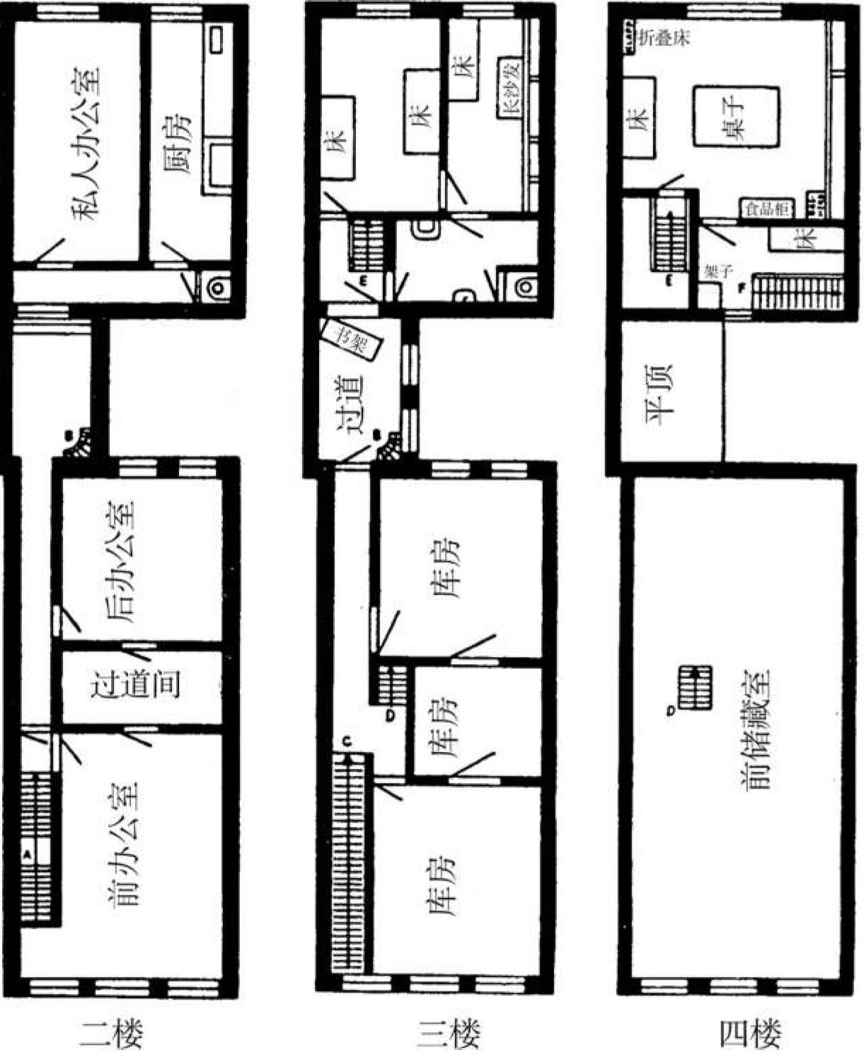 这幢房子的情况是这样的,底层有一间大库房,里面又隔成几间,如把肉桂、丁香和胡椒代用品磨成粉的加工间和储藏室。库房入口处的旁边是屋子的正门。进门以后,穿过一扇中门,走上一道楼梯。楼梯上面有一道毛玻璃门,门上过去写着“办公室”三个黑字。那是前办公室,宽敞,明亮,东西很多。贝普、米普和克莱曼先生白天在那里办公。穿过一个放着衣帽架、大柜和保险柜的通道间,就来到又小又暗而且有点霉味的经理室。从前库格勒先生和范丹先生在那儿办公,如今只有库格勒先生一人了。也可以从过道里通过一扇玻璃门直接进入这间办公室,但是那道玻璃门能从里面开,从外面不容易打开。从库格勒的办公室出来,沿着一条细长的过道,经过煤仓,再上四级楼梯,就来到整幢房子最豪华的部分:私人办公室。贵重的深色家具,铺着漆布的地面上还有地毯、收音机、精致优美的灯具,一切都漂亮极了。旁边有一间宽敞的大厨房,里面有一台直通热水器和两台煤气灶。接着还有一间厕所。这是二楼。