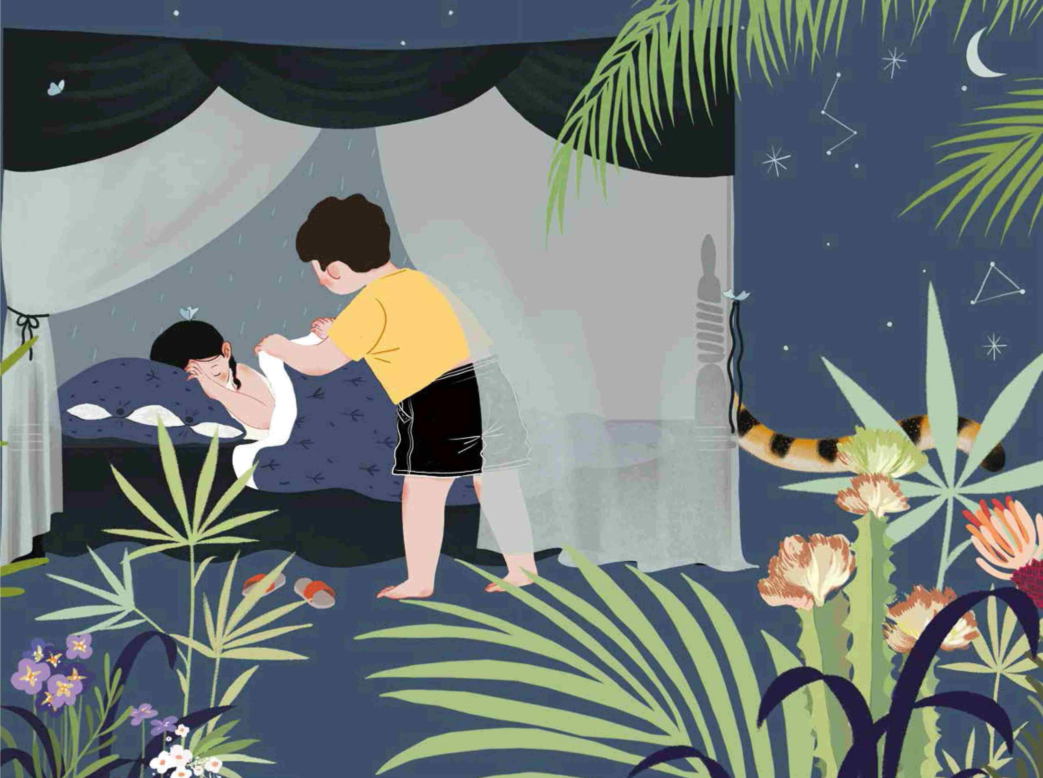 况且晚上就在门前睡觉,不用进屋里去,也用不着到时候就非睡去不可。门前一躺,看着街上的热闹,听着铺户里的留声机,妈妈也不来催促。(老印度有妈妈没有,还是个问题。设若没有,那么老印度未免太可怜了;设若有呢,印度妈妈应该有多么高的身量呢?)困了呢,说睡就睡,也不用等着妹妹,——小坡每天晚上等着妹妹睡了,替她放好蚊帐盖好花毯,他自己才敢去睡。不然,他老怕红眼儿虎,专会欺侮小姑娘们的红眼儿虎,把妹妹叼了去;把蚊帐放好,红眼儿虎就进不去了。