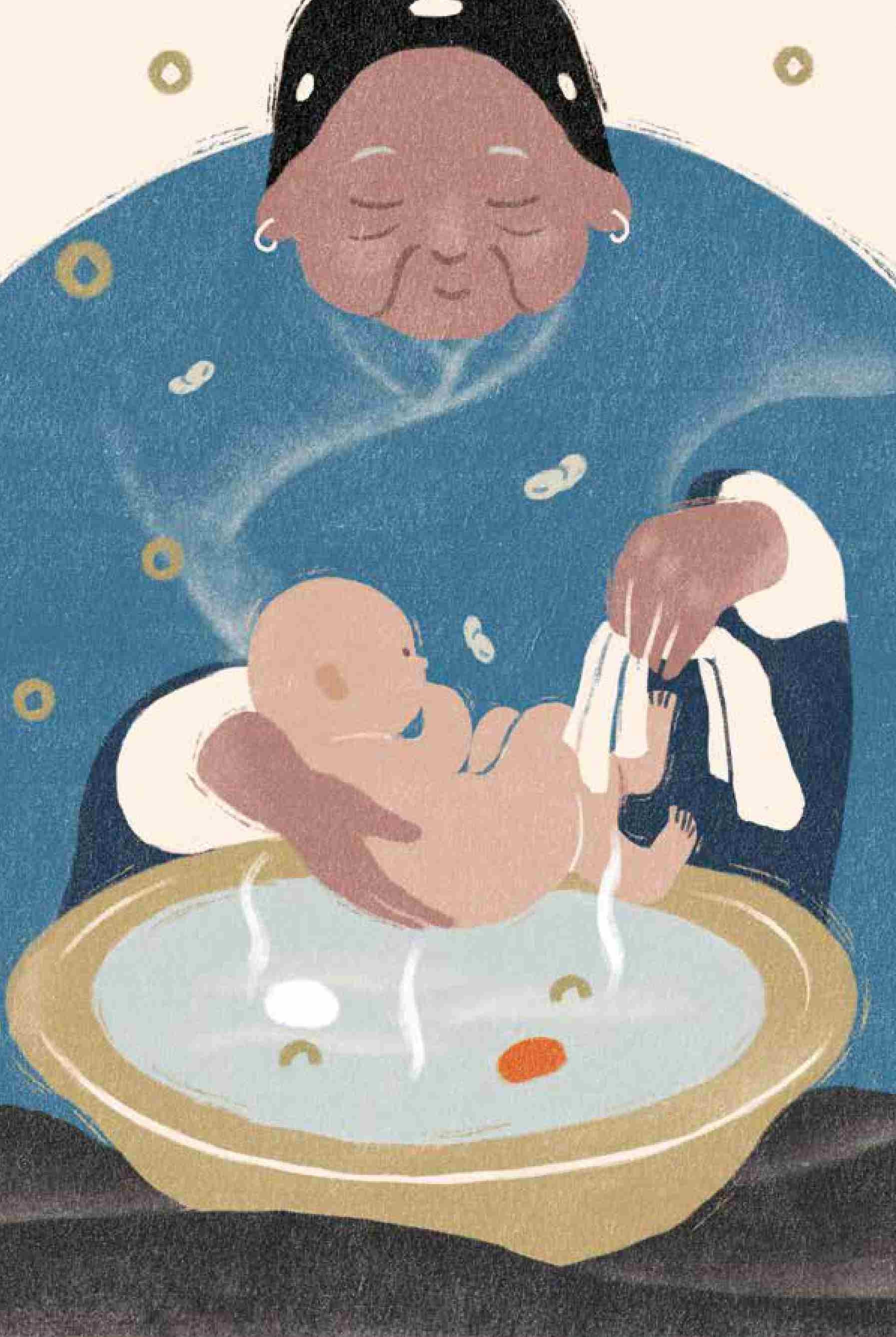 白姥姥在炕上盘腿坐好,宽沿的大铜盆(二哥带来的)里倒上了槐枝艾叶熬成的苦水,冒着热气。参加典礼的老太太们、媳妇们,都先“添盆”,把一些铜钱放入盆中,并说着吉祥话儿。几个花生,几个红、白鸡蛋,也随着“连生贵子”等祝词放入水中。这些钱与东西,在最后,都归“姥姥”拿走。虽然没有去数,我可是知道落水的铜钱并不很多。正因如此,我们才不能不感谢白姥姥的降格相从,亲自出马,同时也足证明白姥姥惹的祸大概并不小。