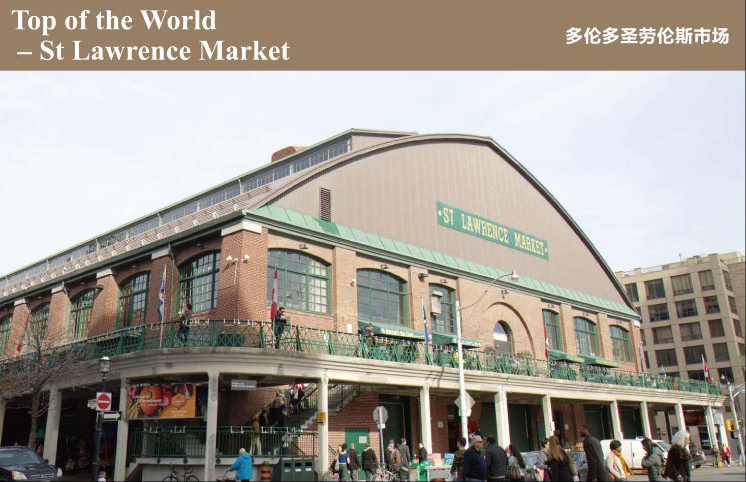 St Lawrence Market has a history of more than 200 years and is located in the center ofToronto’s Old Town. There are three ancient buildings representing the typical architecture inToronto. In the “2012 Top Ten Food Markets” of National Geographic , St Lawrence ranked first inthe world against other markets like Greenmarket of New York Union Square and Castries Marketof St Lucia.