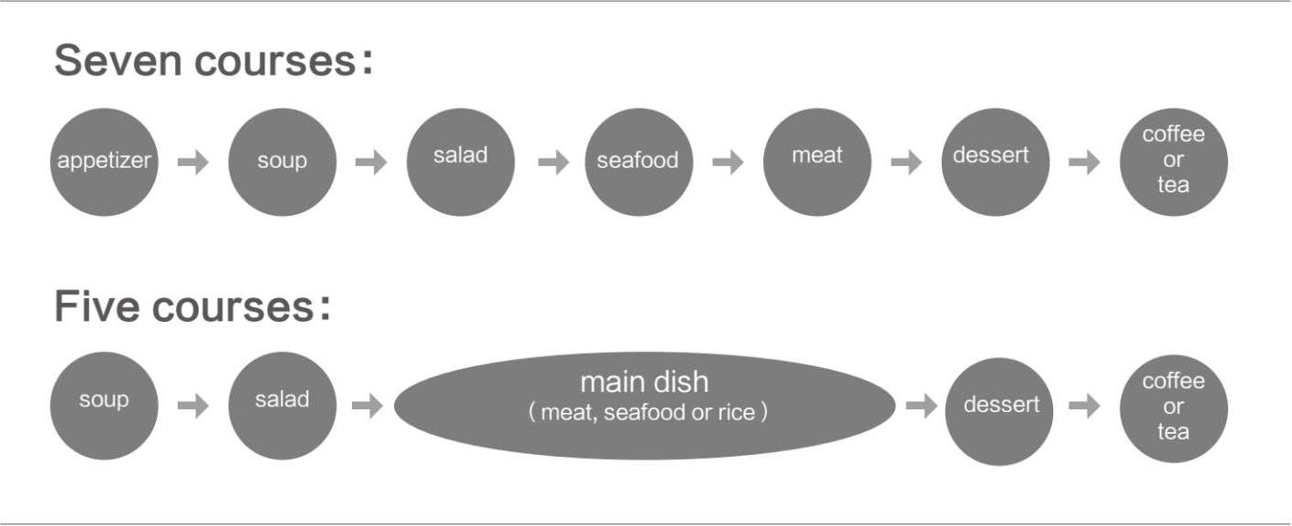 西方各国的餐饮文化有各自的特点,菜式也都不尽相同。西餐可分为法式、意式、英式、美式、俄式等不同风格。