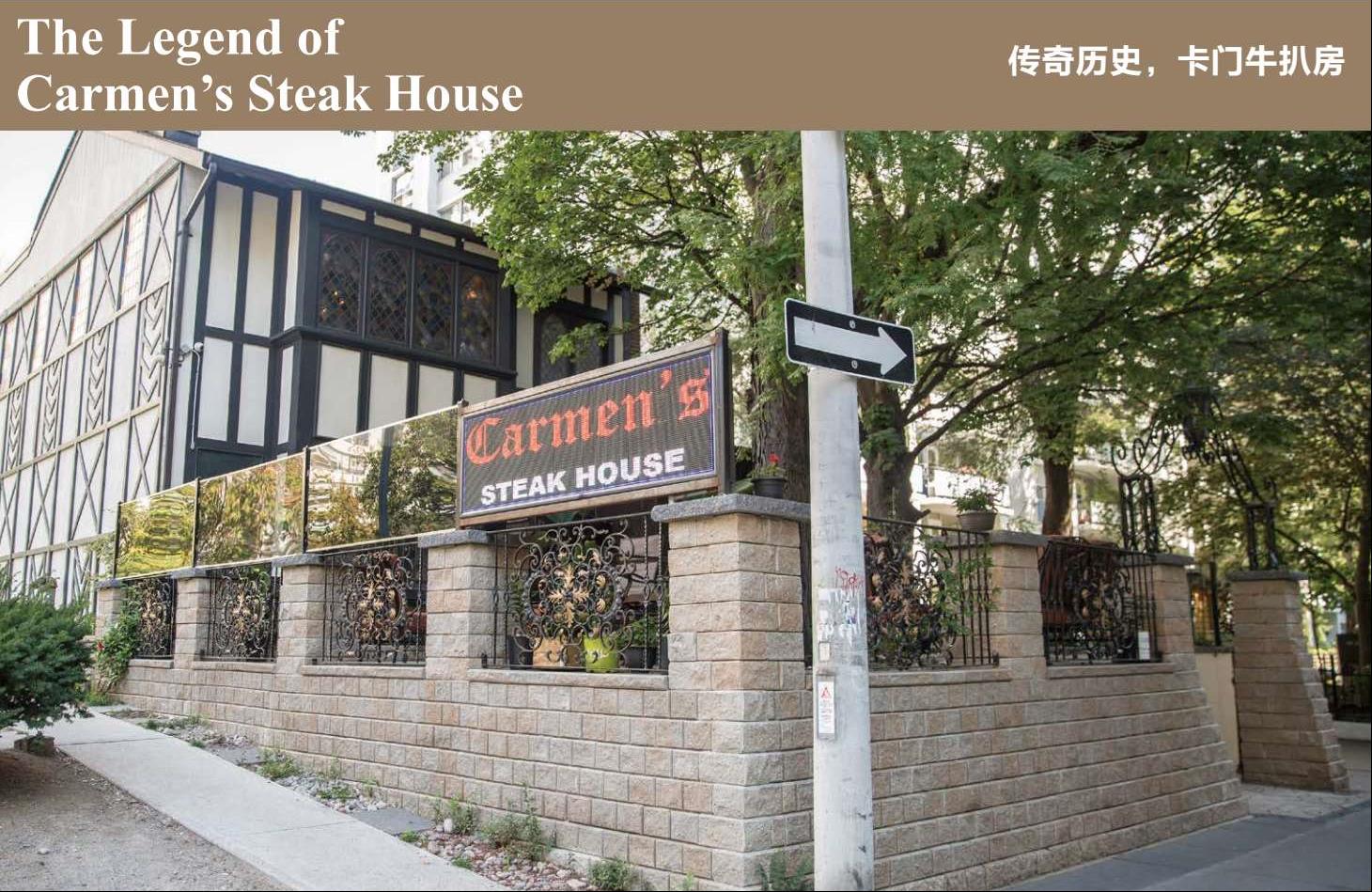 Carmen’s Steak House is the first restaurant that I visited in Toronto. The building hasa history of over 60 years and is listed among protected cultural heritages by the Torontogovernment. Through the historic door, you walk into a narrow corridor with gentle lights andphotos of stars and celebrities on both sides of the wall – these are the legends of Carmen’s SteakHouse. Through the door on the left and you can see the quiet and luxuriant dining space and atthe end of the corridor is the classic main dining hall. Climbing the stairs to the second flour, youcan see a spacious party room and a few private rooms. The old Swarovski crystal chandelier,the colorful church window glass with celebrities’ names on it, the tall fireplace, ancient woodenchairs, antiques, frescos and decorations reflect mysterious color under the soft light – everythinghas witnessed the past and the legend of old Carmen’s Steak House.