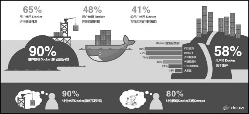 对于按需部署或部署到云环境,Docker提供了独一无二的选择:80%的用户表示Docker已经成为云策略的一部分;35+%的用户使用Docker来避免被云服务供应商绑定。