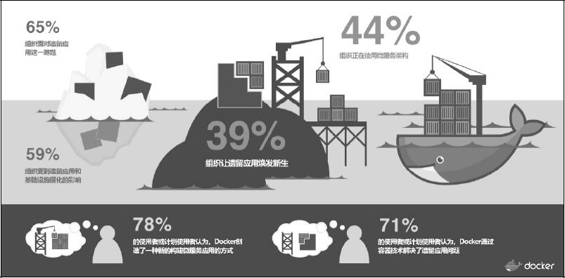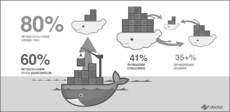 对于按需部署或部署到云环境,Docker提供了独一无二的选择:80%的用户表示Docker已经成为云策略的一部分;35+%的用户使用Docker来避免被云服务供应商绑定。