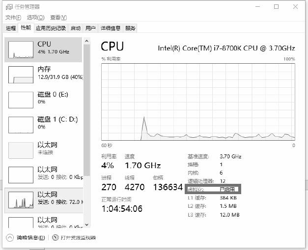 安装完后,会提示重启电脑。重启后会自动启动Docker程序,如果未启用虚拟化配置就会弹出如图3-1所示的错误提示,此时需要在Windows功能中启用Hyper-V功能(请参考图3-2)并在BIOS系统的CPU配置中打开“虚拟化配置”;如果虚拟化已启用,那么“任务管理器”的CPU面板中会显示已启用虚拟化,如图3-3所示。