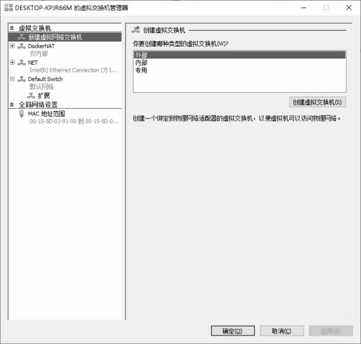 打开后,单击“新建虚拟网络交换机”选项,创建一个外部虚拟交换机,如图3-20、图3-21所示。