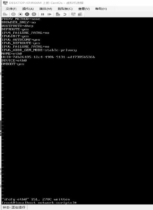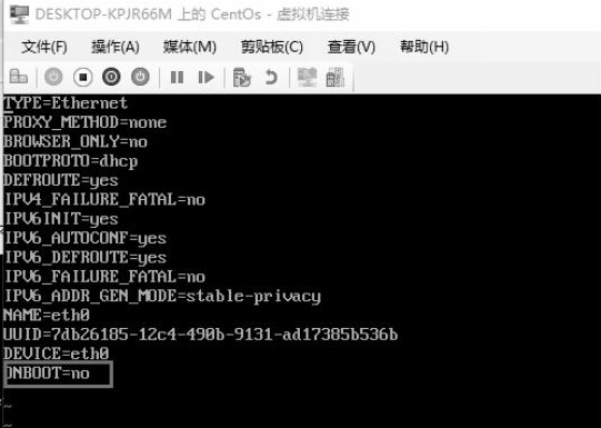 CentOS的网卡设置默认是开机不启动的,如图3-40所示。我们需要修改设置,即将“ONBOOT=no”修改为“ONBOOT=yes”,如图3-41所示。