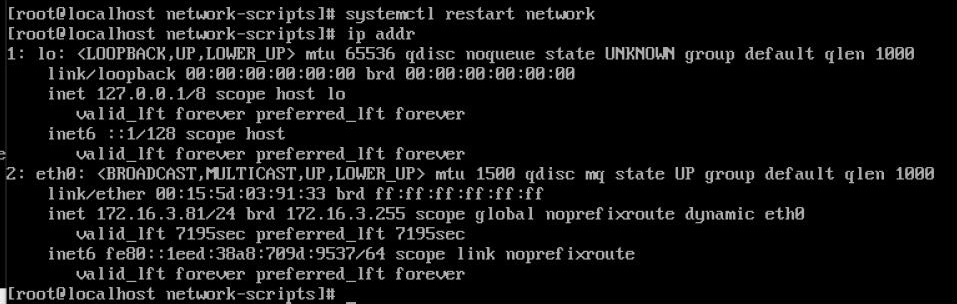 值得说明的是,vi是CentOS 7内置的文本编辑器,修改完成后可以按下Esc键退出编辑模式,然后输入“:wq”来保存并退出。重新启动网络服务之后我们就得到了当前的IP地址(见图3-42):
