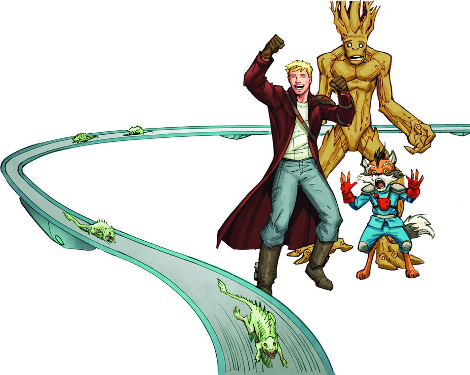 The next day Peter’s friends the Guardians, could tell he was down, and they tried to cheer him up. Rocket and Groot took him to the Orlani races.