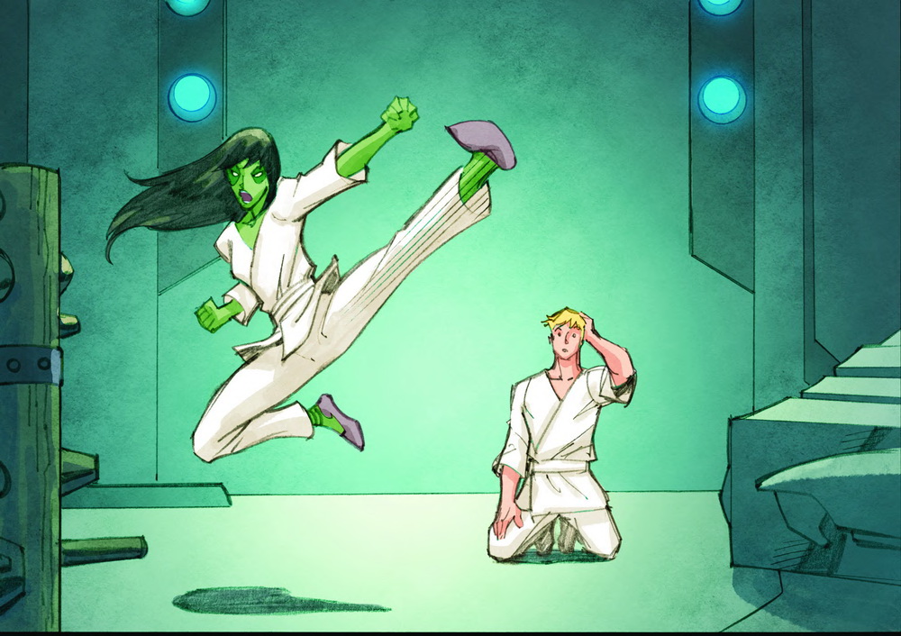 Peter’s friends didn’t give up trying to cheer him up. Gamora took Peter to the space dojo to show him some cool new fighting moves. But when Peter tried them, he fell flat on his face!