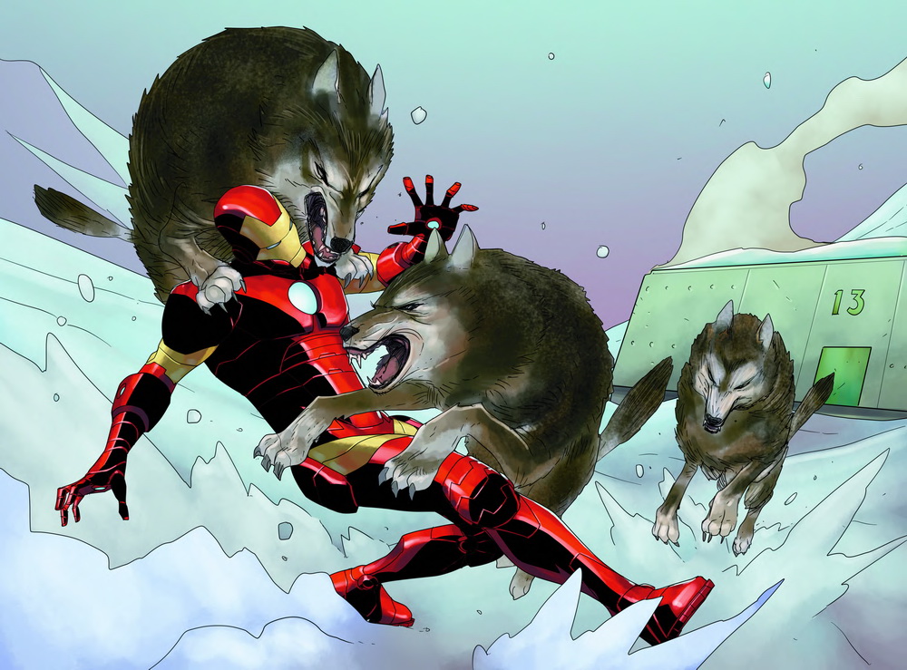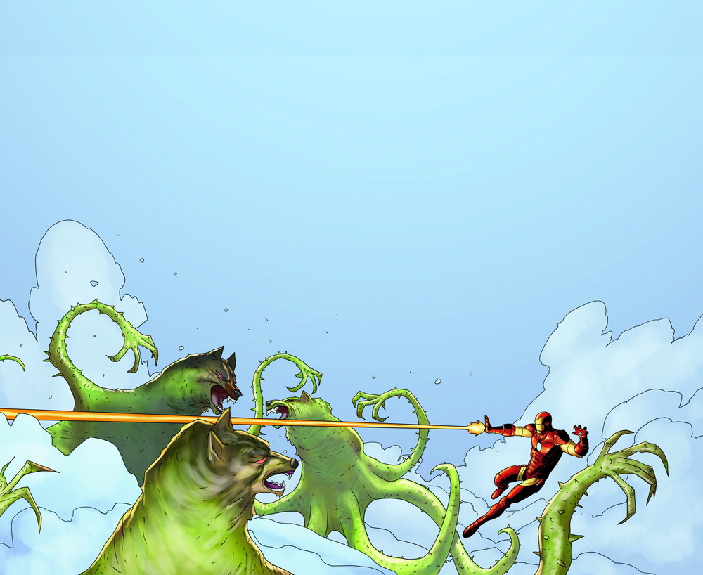“Whoa, nice doggies!” said Tony, holding his palms out toward the canines. “Uh, roll over! Fetch?” Where’s a stick when you need one? he thought, moving forward. Before he could take another step, one of the dogs jumped and slammed into his armor, knocking him down. Tony scrambled to his feet as another dog smashed his helmet with its giant front paws. Then the remaining dog started vibrating and shaking, and one of its large forepaws morphed into a long tentacle! The appendage wrapped around Tony’s right arm and squeezed the armor so tightly that it started to bow and bend under the pressure.