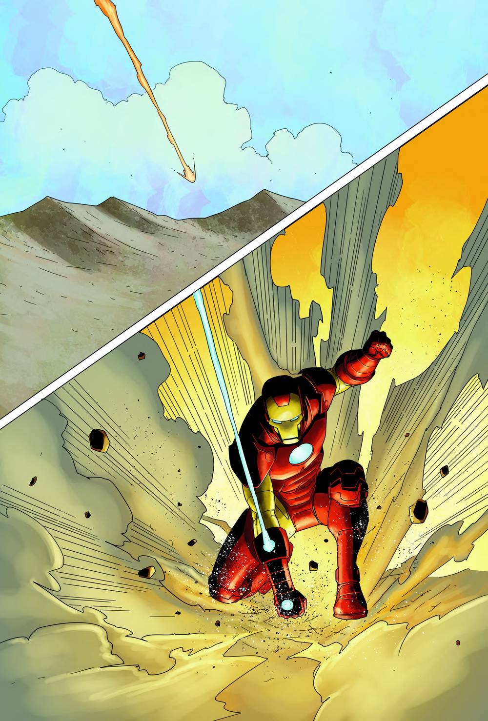 Thinking fast, Tony fired rapid repulsor bursts at the ice mounds the creatures were using as protection, causing them to dive out of the way. Next he fired a blast at a metallic cylinder that extended from Outpost 13 into the ice below, ripping open an Iron Man-size hole. Then heactivated his boot jets, thrust himself past the beasts, and soared into the cylinder.