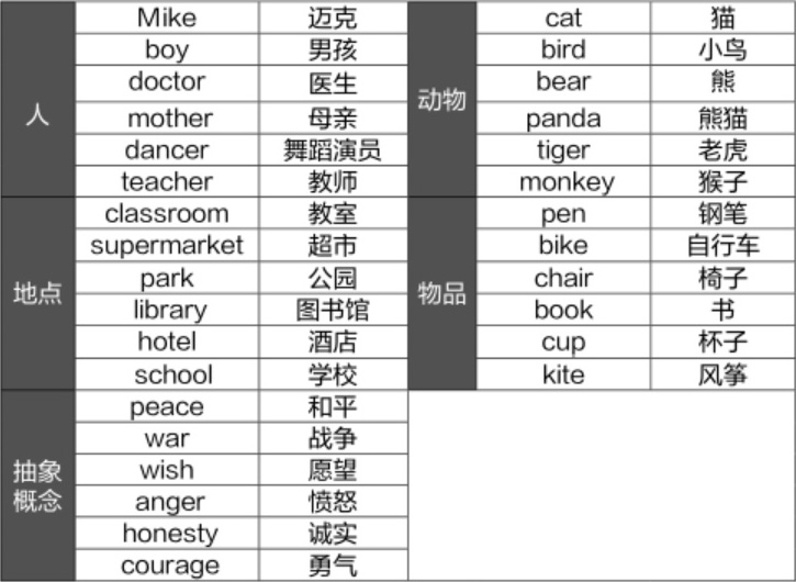 名词是表示人、动物、地点、物品以及抽象概念的词。例如: