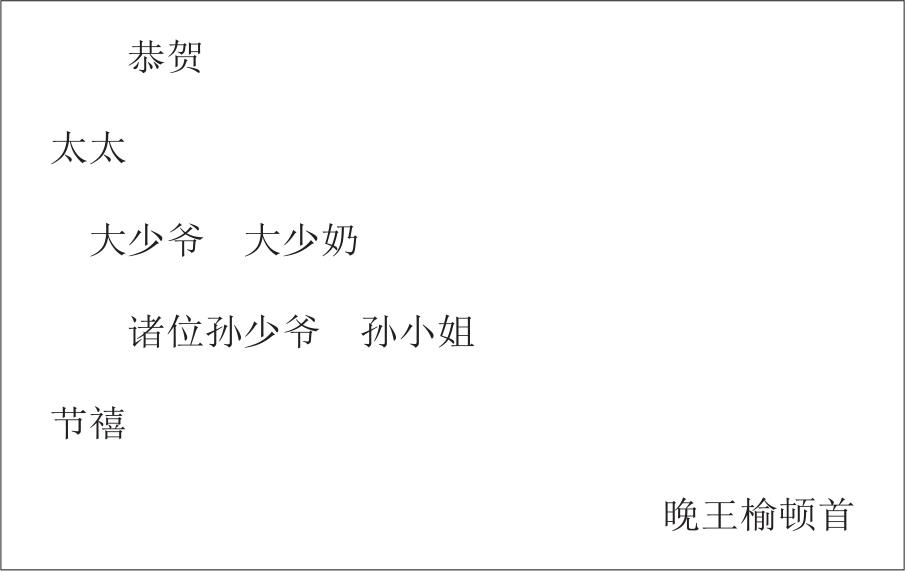 此后每逢一个年节,他还是寄那红红的贺笺来,不过贺笺上,在恭贺“太太,大少奶,孙少爷”之下,又加添上了一个“孙少奶”的称谓。从去年起,他的贺笺的信封上,写的是“水亭分卡王寄”,显然地他又有了很好的差事,又做了卡长了。