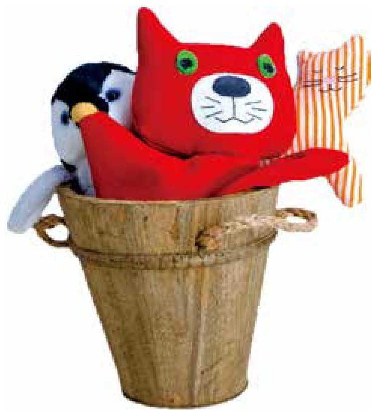 2 妈妈手拿着玩具小猫,在宝宝眼前边晃动边说:“喵喵,小猫来了。”