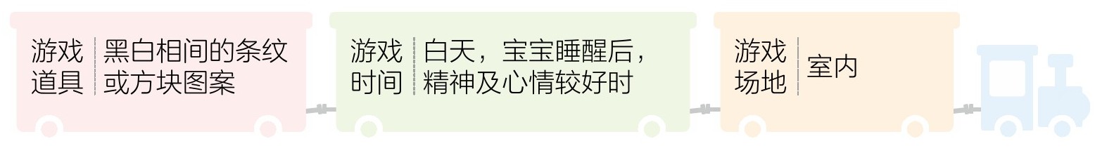 2 拿起道具:黑白相间的条纹或方块图案,放在距宝宝眼睛19cm的地方,边移动边唱儿歌:“黑框框,白框框,动一动,晃一晃,宝宝看,看清了”。
