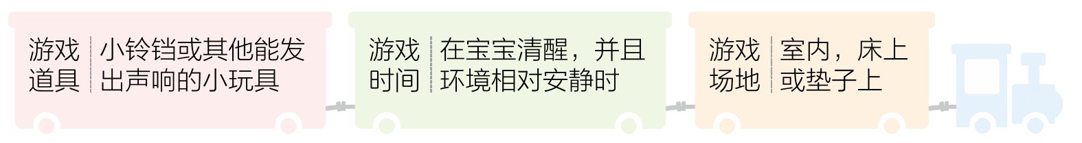 3 换一个方向摇晃铃铛,宝宝寻声看到铃铛后,停止晃动(以上动作重复3~5次)。