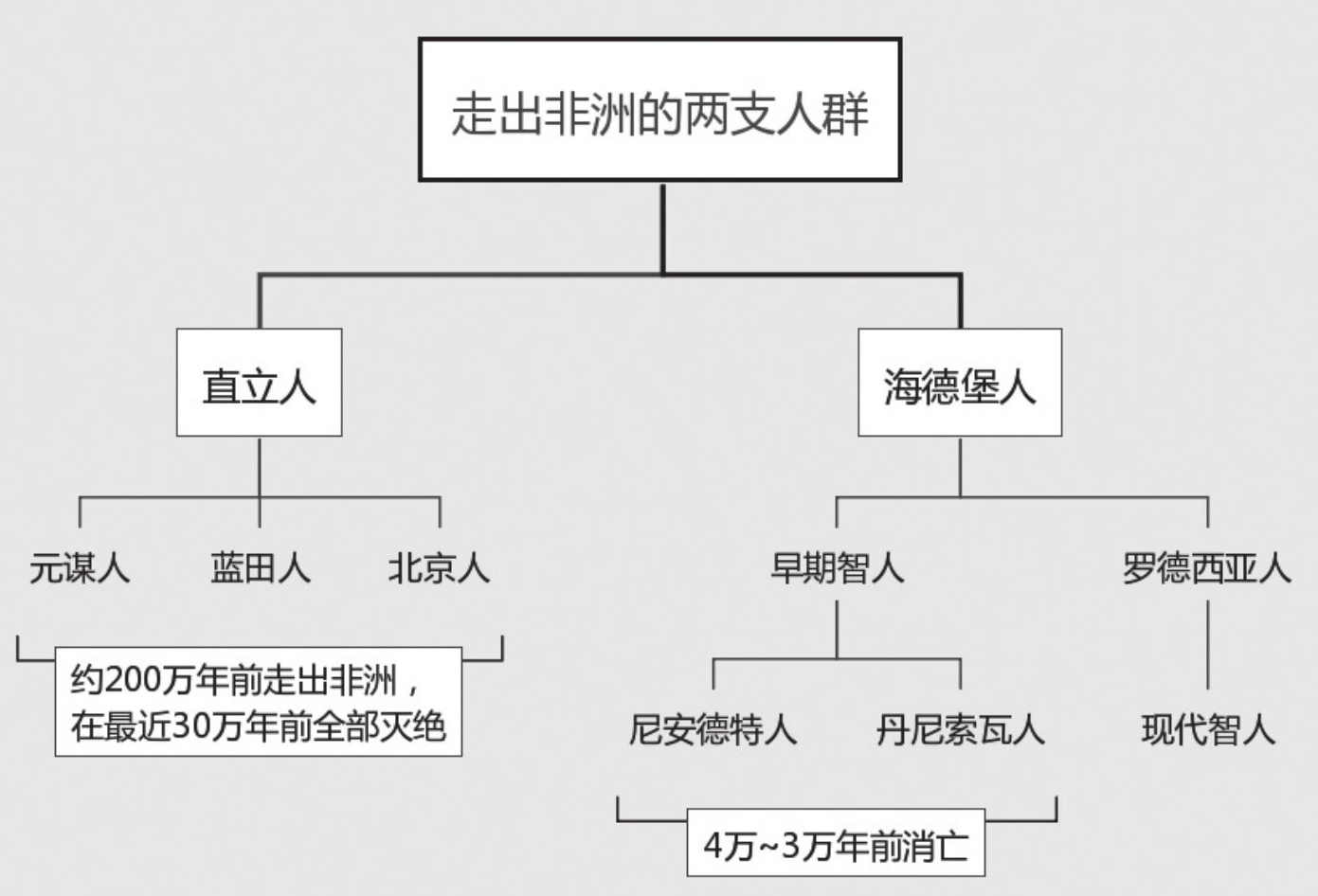 我们刚刚提到,元谋人、蓝田人、北京人等早期人类的祖先直立人,在大约200万年前就已经走出过非洲,不过他们的后代在最近30万年前都已灭绝了。产生出罗德西亚人的祖先海德堡人,形成于100多万年以前,他们后裔中的一支,在80万年前也曾经走出非洲,然后在约50万年前分离并且逐渐演化为智人的另外两个亚种,又称为早期智人,那就是尼安德特人和丹尼索瓦人,两者都曾与现代人共存于世直到三四万年前,并且相互间有过生殖的交流。所以我们现代人体内除了罗德西亚人的基因以外,还有少部分基因来自尼安德特人和丹尼索瓦人。