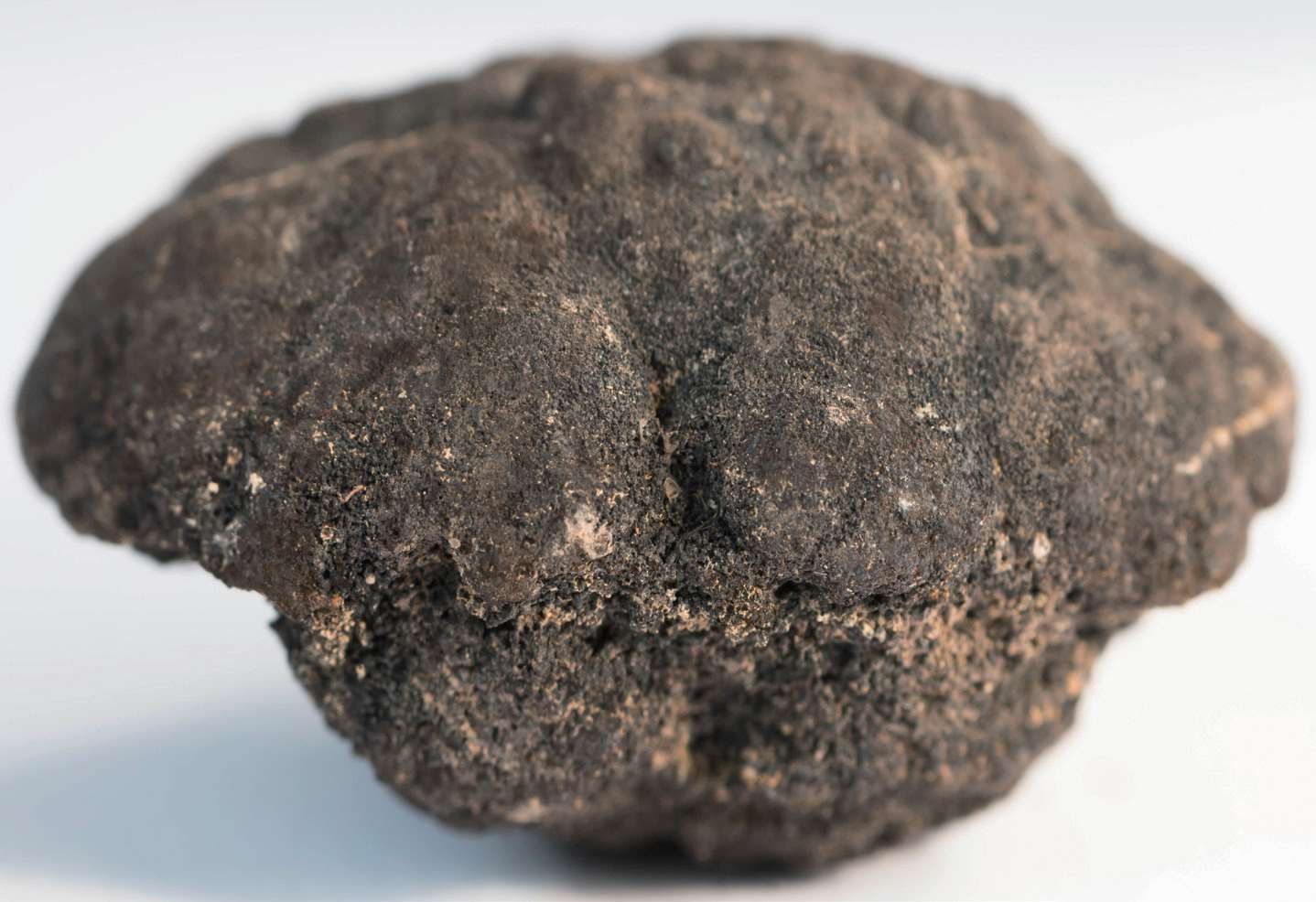 锰结核又称多金属结核、锰矿球、锰矿团、锰瘤等,它的形态多样,有球状、椭圆状、马铃薯状、葡萄状、扁平状、炉渣状等。表面呈黑色或棕褐色,性脆,硬度小,全身有细孔,比同体积的水重两三倍。