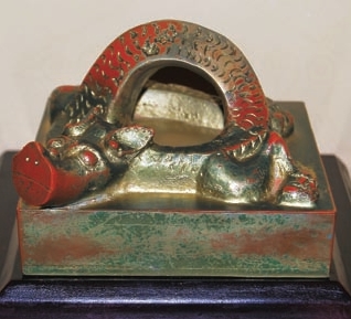 蟠龙钮是一条龙蜷曲的样子,龙的首尾和两足分置在4个角上,似腾飞疾走,印面槽沟和印台四周壁面都有碰撞和划伤的痕迹,而且还遗留着一些暗红色的印泥。印台背上的龙,有些部位磨得十分光滑,说明这枚金印是墓主人生前日常行使王权的大印。