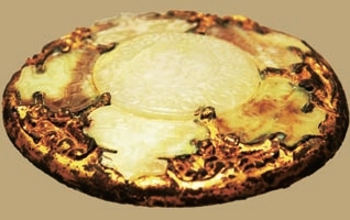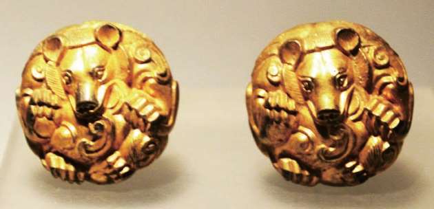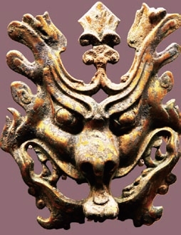 在乐浪古墓与新疆博格达沁古城址中所发现的金质龙纹带扣,式样相仿,上面均有一条大龙和6条小龙出没于缭绕的云气之中。其构图之生动,工艺之精细,已臻汉代金银器之极致。