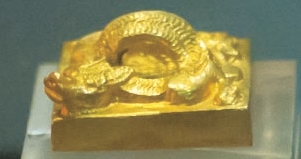 在河北省定州北陵头村东汉墓中所发现的金龙头,不仅其金粒和金丝的组织更加精巧,连龙角上都缠以纤细的金丝,其上还镶嵌有绿松石和红宝石。