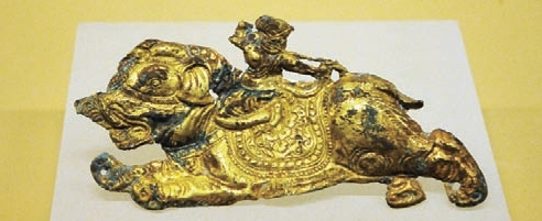 与金奔马同一墓中还发现了一件颇具鲜卑装饰特色、造型极为新奇的金瑞兽,可惜原镶嵌物已经失落。
