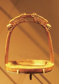 而冯素弗墓中的两只马镫以桑木为心揉作圆三角形,上出长系,外包钉镏金铜片,是早期马镫中有确切年代的一副,是研究马具的发展和断代的重要资料。