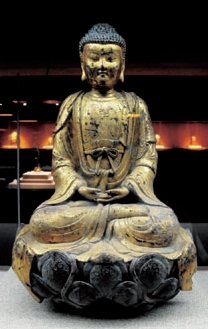 还有北魏青铜镀金释迦牟尼佛坐像,高40.3厘米,重3954克。释迦牟尼佛结跏趺坐于双层台座之上,右手做无畏印,左手握衣角,身着袒右肩式僧祇支,外披大衣,双肩衣纹如火焰般外扬,面部神情庄严,气势雄伟。
