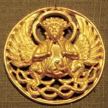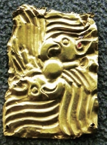 第二件则具有马头特征,高18.5厘米,宽12厘米,重70克。头额部原镶嵌料石,现已脱落,眉梢上端另加一对圆圈纹,所有花纹和脸框周围饰鱼子纹。面部嵌白、淡蓝色料石。
