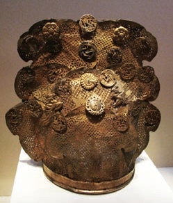 其中大冠通体都用黄金做成,高28厘米,从根基部凸起一脊,两边镂空为云纹,周边还布满着针孔。上面是短而粗的树干,分成3个主柱,又分出16个分枝。枝是用金丝做成的,边前伸边间断地缠绕成若干个圆环。