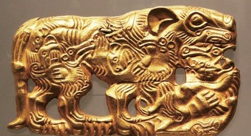 在一件长10厘米的四兽形金饰牌的背面,錾刻有“猗竾金”3字,猗即拓跋鲜卑三部之一猗部,可见这是该部首领的遗物。
