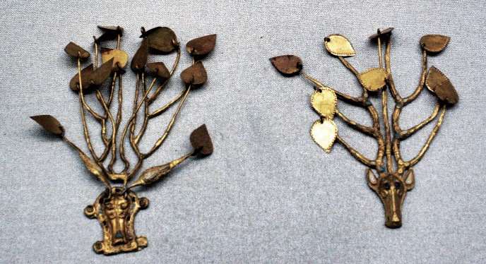 第一件头部轮廓似牛首,高19.5厘米,宽14.5厘米,重92克。头部边缘饰鱼子纹,内作连弧纹装饰。在牛首之面部及双耳镶嵌红、白石料,耳作桂叶形,角似盘曲多枝的连理扶桑树,又像变形的鹿角,每个枝梢上环穿桃形金叶1片,共14片。
