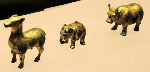 在内蒙古自治区科尔沁左翼中旗希伯花鲜卑墓中发现的北魏金瑞兽,长9厘米,高7.7厘米,形似一奔走的瑞兽。造型奇特,具有浓郁的鲜卑民族特色。