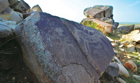 在这段长约3000米的秦长城内侧,朝南凿刻着百余幅阴山岩画,有北山羊、骆驼、驼鹿、舞者、骑士等,还有突厥文形的符号,造型生动,形象逼真。