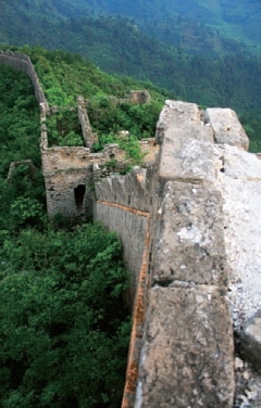 从这段遗址还可以看到,筑长城的民工和驻兵是把附近的山石一块块切割下来,磨平后干砌在城上,每块石片重的有二三十千克,轻的有四五千克,这样干砌起来的长城,历经千年而不塌。