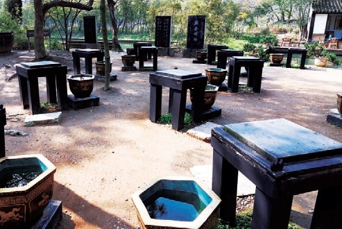 临池十八缸是由十八缸、习字坪、太字碑组成。这是根据“王献之十八缸临池学书,王羲之点大成太”这一典故而来。