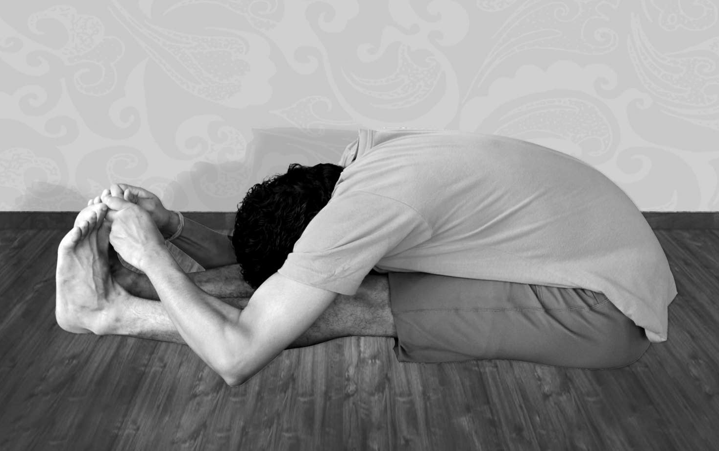 像木棍一样在地上把双腿伸展开来,双手抓住双脚的脚趾,前额放在双膝之间。这就是背部伸展式。