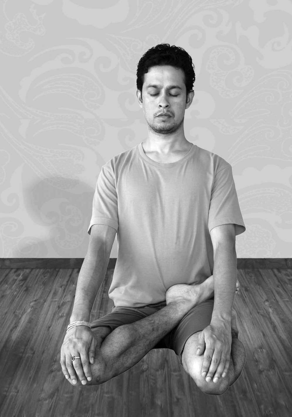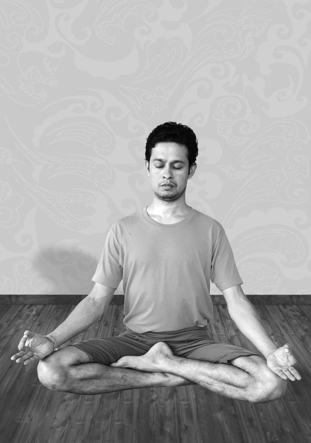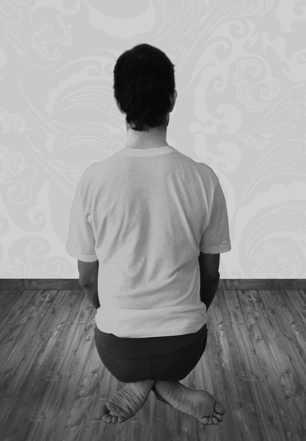 双脚脚掌插入大腿和膝关节之间,脊柱挺直地坐正。据说这就是万字吉祥坐(svastikasana,简称吉祥坐)。