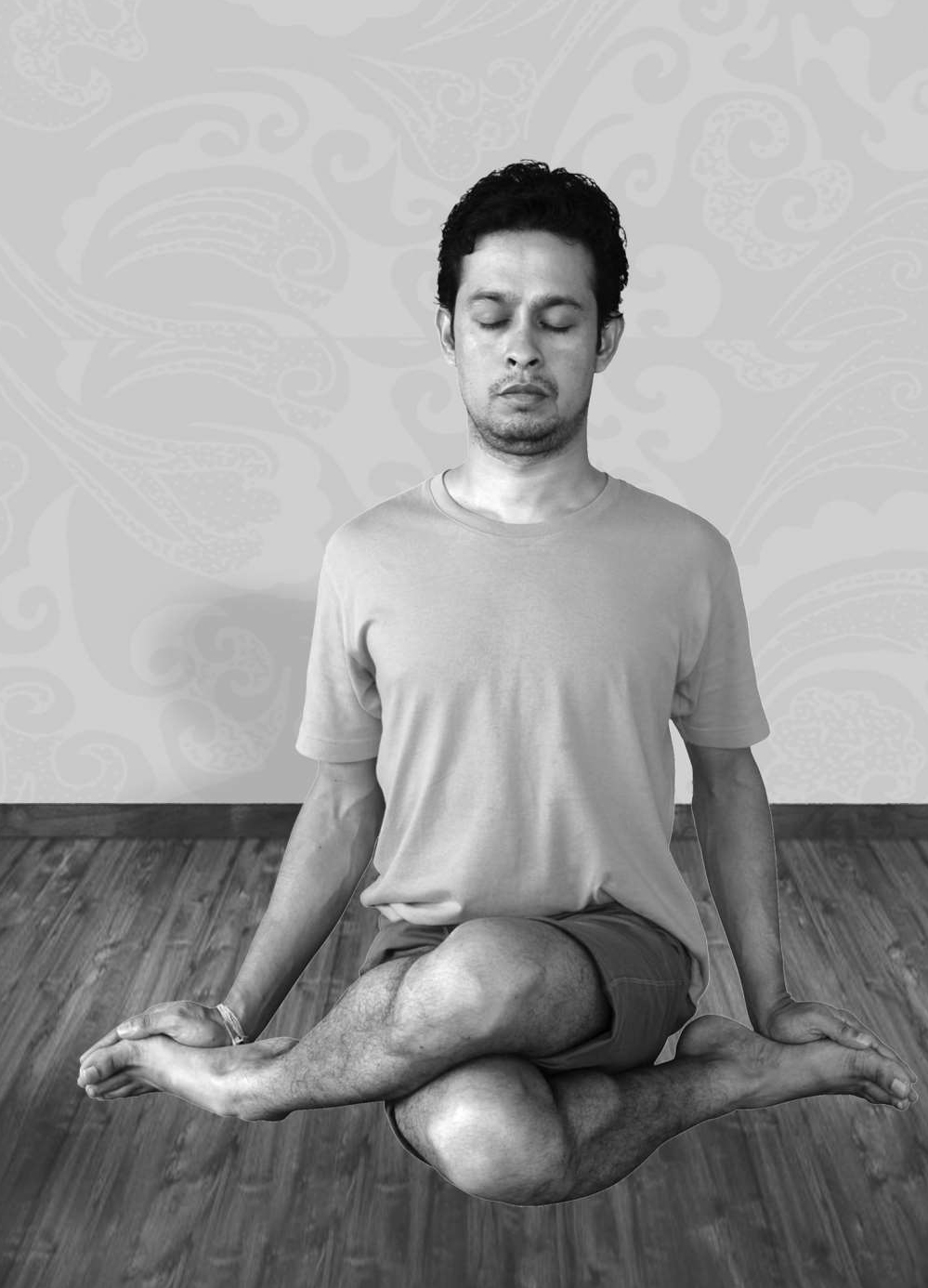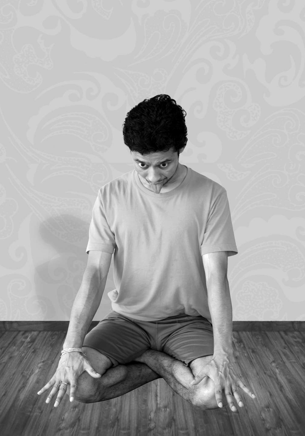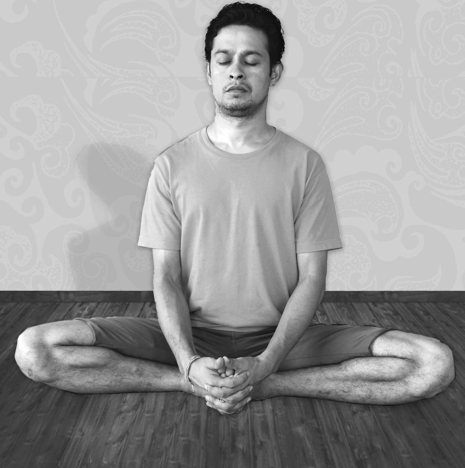双脚脚掌插入大腿和膝关节之间,脊柱挺直地坐正。据说这就是万字吉祥坐(svastikasana,简称吉祥坐)。