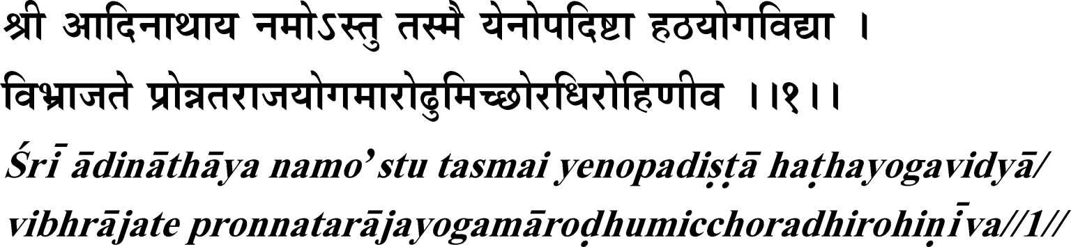 向宇宙的第一个解释者和宇宙的主人室利·阿迪纳塔顶礼。他教导我们哈达瑜伽这门知识。对于那些渴望攀登上三摩地(Samadhi)或胜王瑜伽(Rajayoga)这一瑜伽之巅的人们来说,这门知识将照亮他们,成为他们抵达顶峰的梯子或垫脚石。