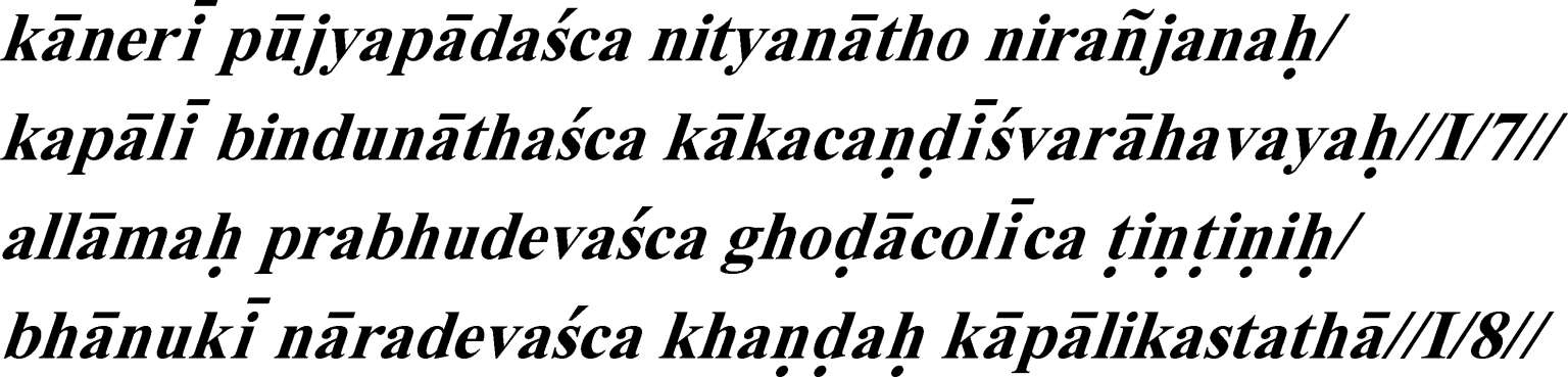 [这些大师包括]室利·阿迪纳塔尊者、玛司延德拉尊者、萨巴罗尊者、阿南达哈罗瓦尊者、考朗吉尊者、弥纳尊者、高罗克萨尊者、维茹帕克萨尊者、毕勒萨亚尊者、曼塔纳尊者、贝罗瓦尊者、悉地尊者、佛陀尊者、坎塔迪尊者、考朗塔卡尊者、桑罗南达尊者、悉地帕达尊者、卡帕提尊者、卡内瑞尊者、普周阿帕达尊者、尼提亚那塔尊者、尼冉迦纳尊者、卡帕利尊者、彬顿纳塔尊者、卡卡克迪斯瓦罗尊者、阿拉玛尊者、帕布德瓦尊者、高达考利尊者、廷提尼尊者、巴奴基尊者、那罗德瓦尊者、卡尼达尊者、卡帕利卡尊者。