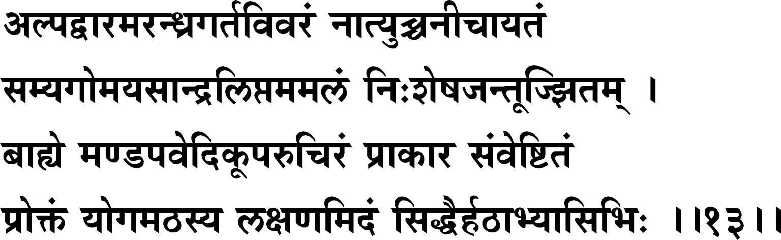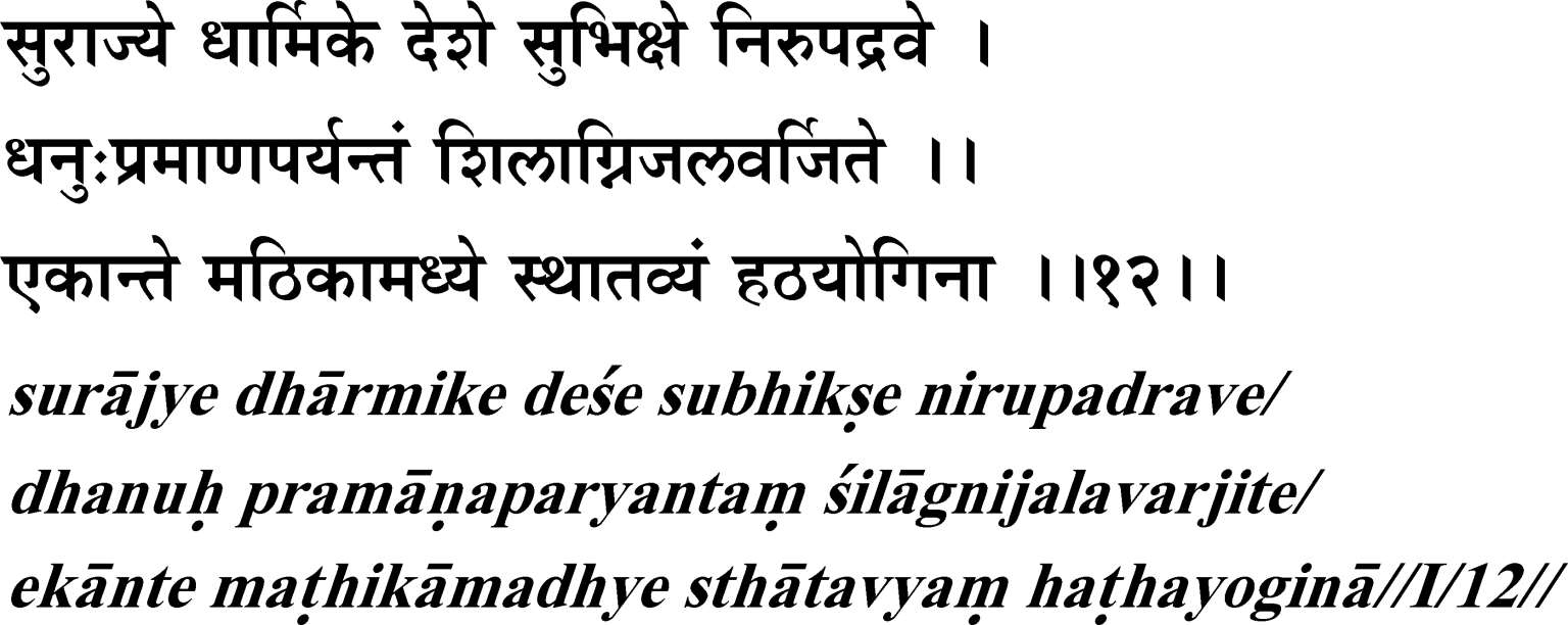 哈达瑜伽练习者应在管理规范的地方建一所小屋,那里人们各司其职,容易得到施舍,练习瑜伽不会受到任何干扰。小屋各个方向四肘尺距离的范围内没有石头、火或者水。瑜伽士要在这样一个孤僻之处练习瑜伽。