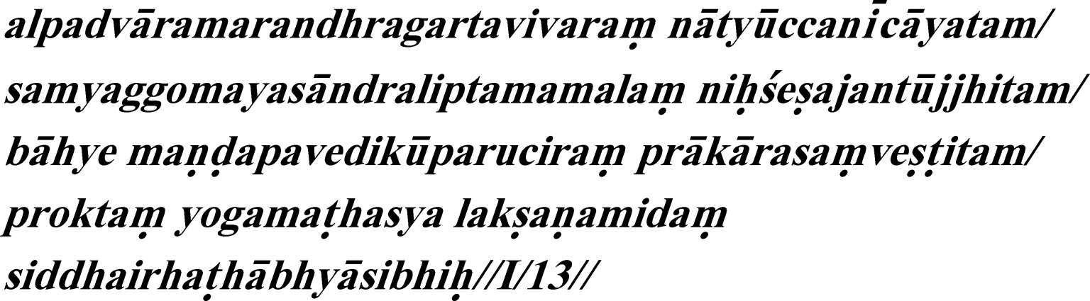 有造诣的瑜伽士、瑜伽练习者应该建造一间瑜伽小屋,小屋要有如下特征:应该有小门,不应该有任何的凹陷之处、洞或通道;既不要太高,也不要太低或者太宽;为了纯洁、干净,完全杜绝蚊虫之咬,小屋要适当地涂上潮湿的母牛粪;屋外要有一个漂亮的遮篷、一座祭坛、一口水井,还应有一围墙加以适当的保护。