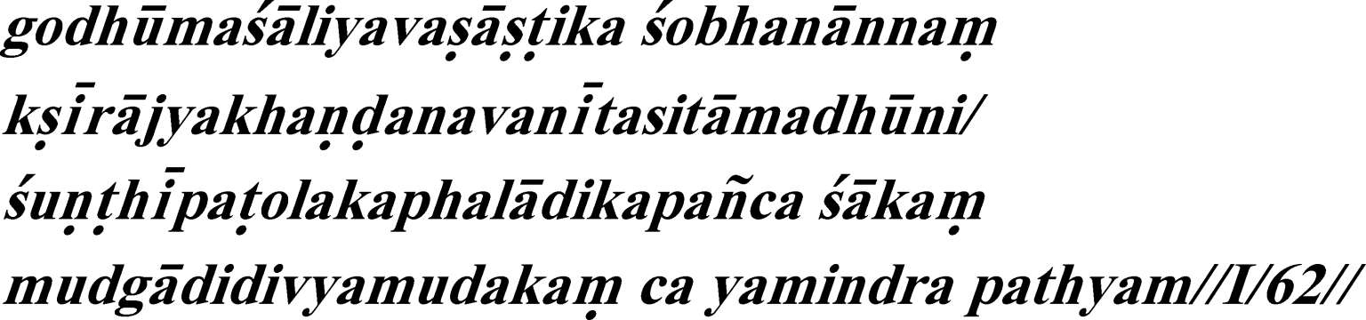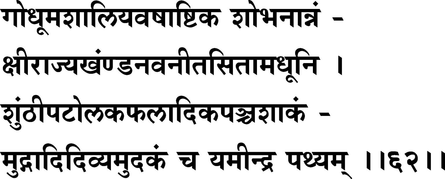 六十天长成的小麦、稻米、大麦等谷物,牛奶、酥油、棕榈糖、黄油、糖、蜂蜜、干姜、黄瓜、水果等,五种绿叶蔬菜、黑绿豆、雨水,这些食物品种对于瑜伽练习者都是有益的。